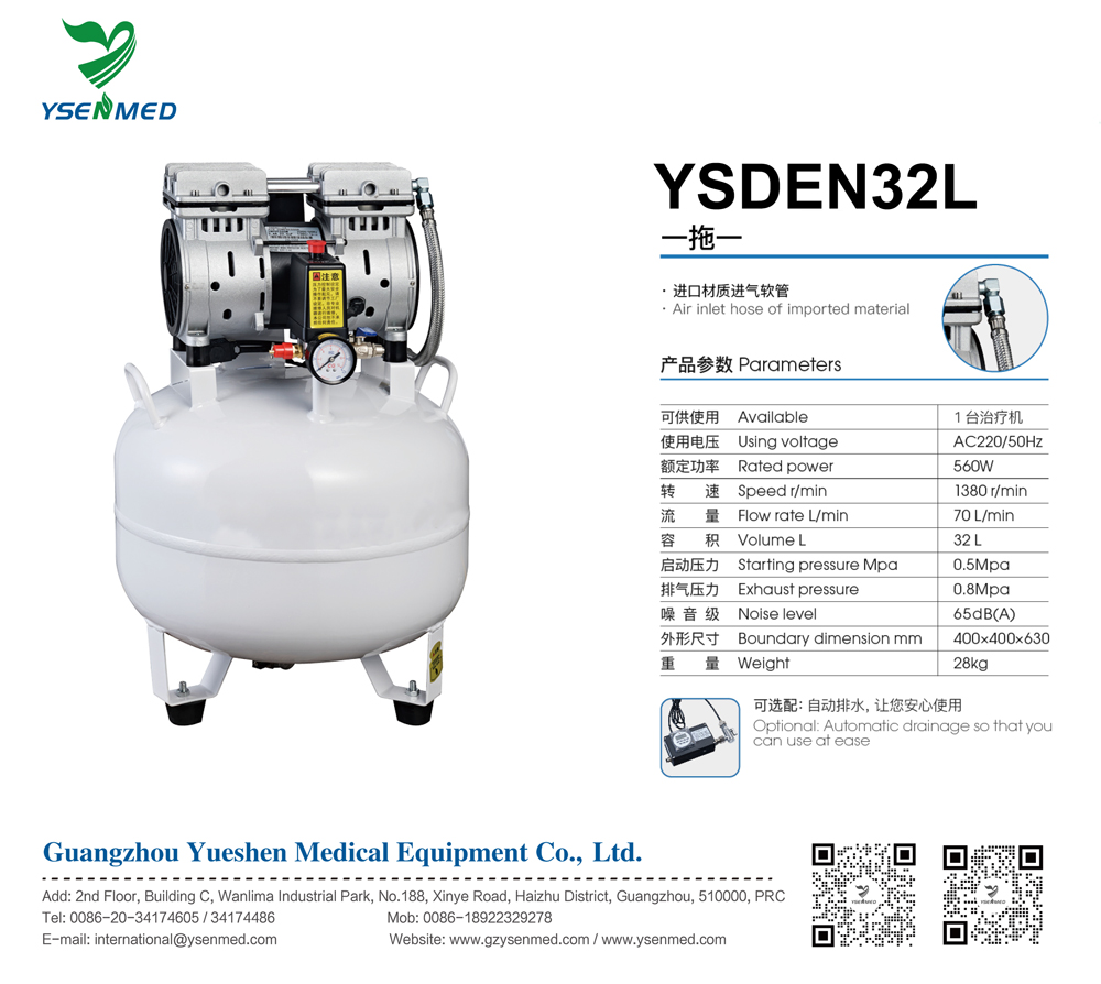 Compresseur d'air dentaire sans huile YSDEN32L : alimentation en air de qualité médicale fiable et silencieuse pour les cliniques et les cabinets dentaires professionnels.