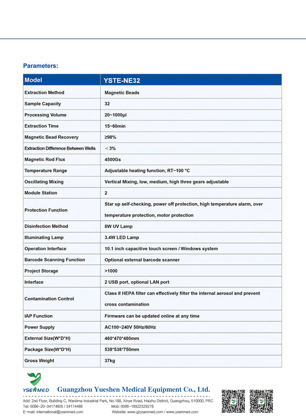 YSTE-NE32 est un équipement de purification d'acides nucléiques extraits automatiquement, à haut débit et haute sensibilité. Les kits d'extraction d'acides nucléiques correspondants permettent d'extraire automatiquement les échantillons d'acides nucléiques. Flexible, stable et économique, il est équipé d'un dispositif de filtration efficace et d'une porte de sécurité. Il permet d'éviter efficacement les infections croisées et de garantir la qualité de l'extraction.