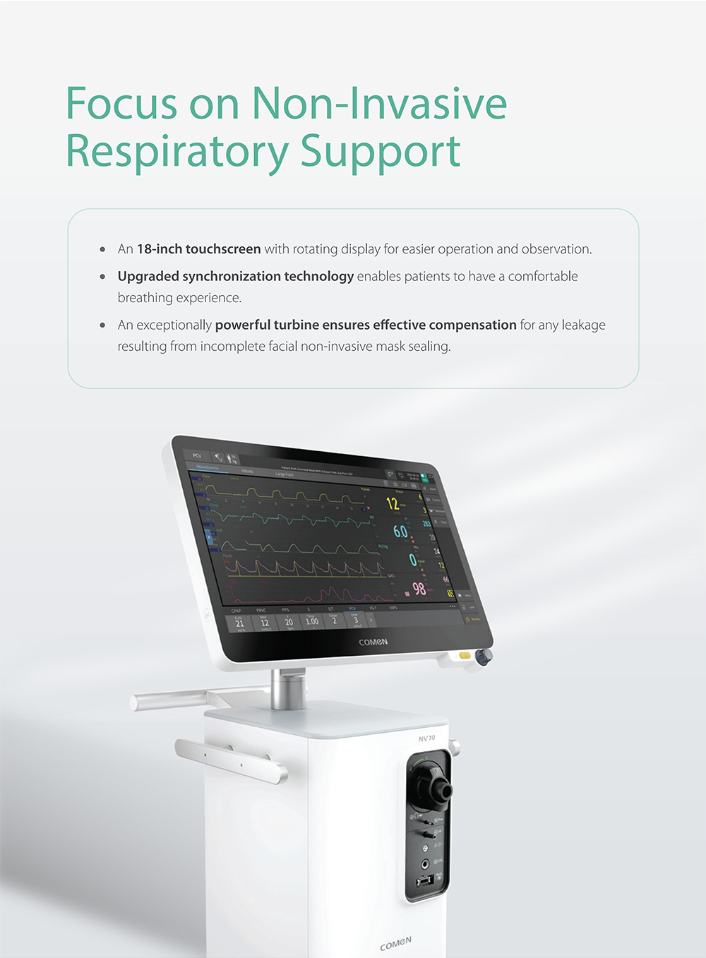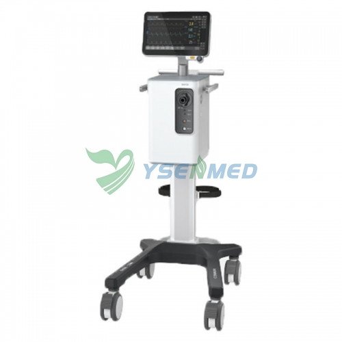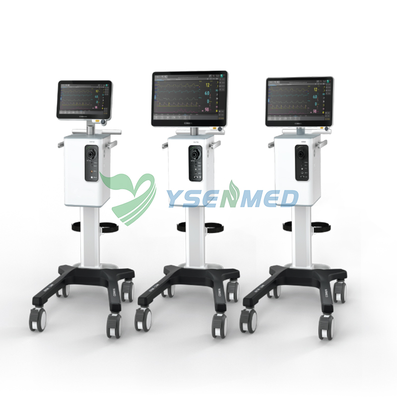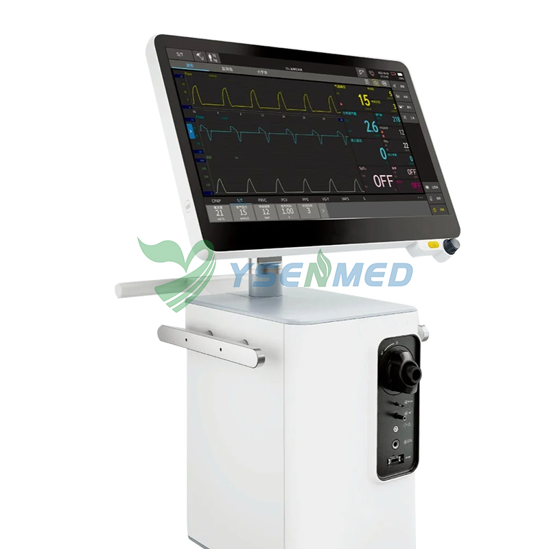 Respirateur médical à écran tactile de 12,1 pouces pour adultes, enfants et nourrissons. Prise en charge multimode invasive/non invasive, auto-étalonnage et auto-nettoyage par aspiration.