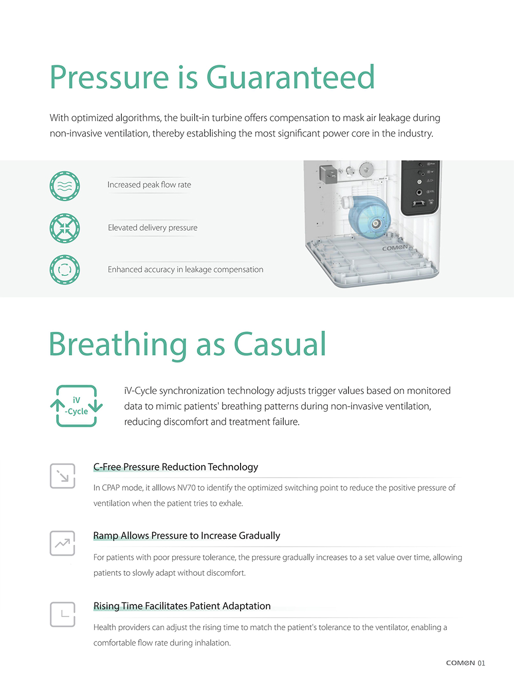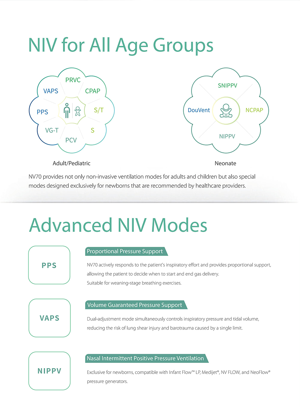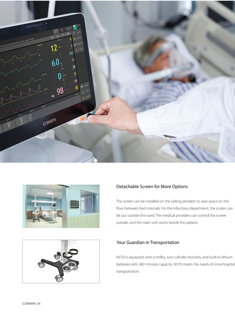 Respirateur médical à écran tactile de 12,1 pouces pour adultes, enfants et nourrissons. Prise en charge multimode invasive/non invasive, auto-étalonnage et auto-nettoyage par aspiration.