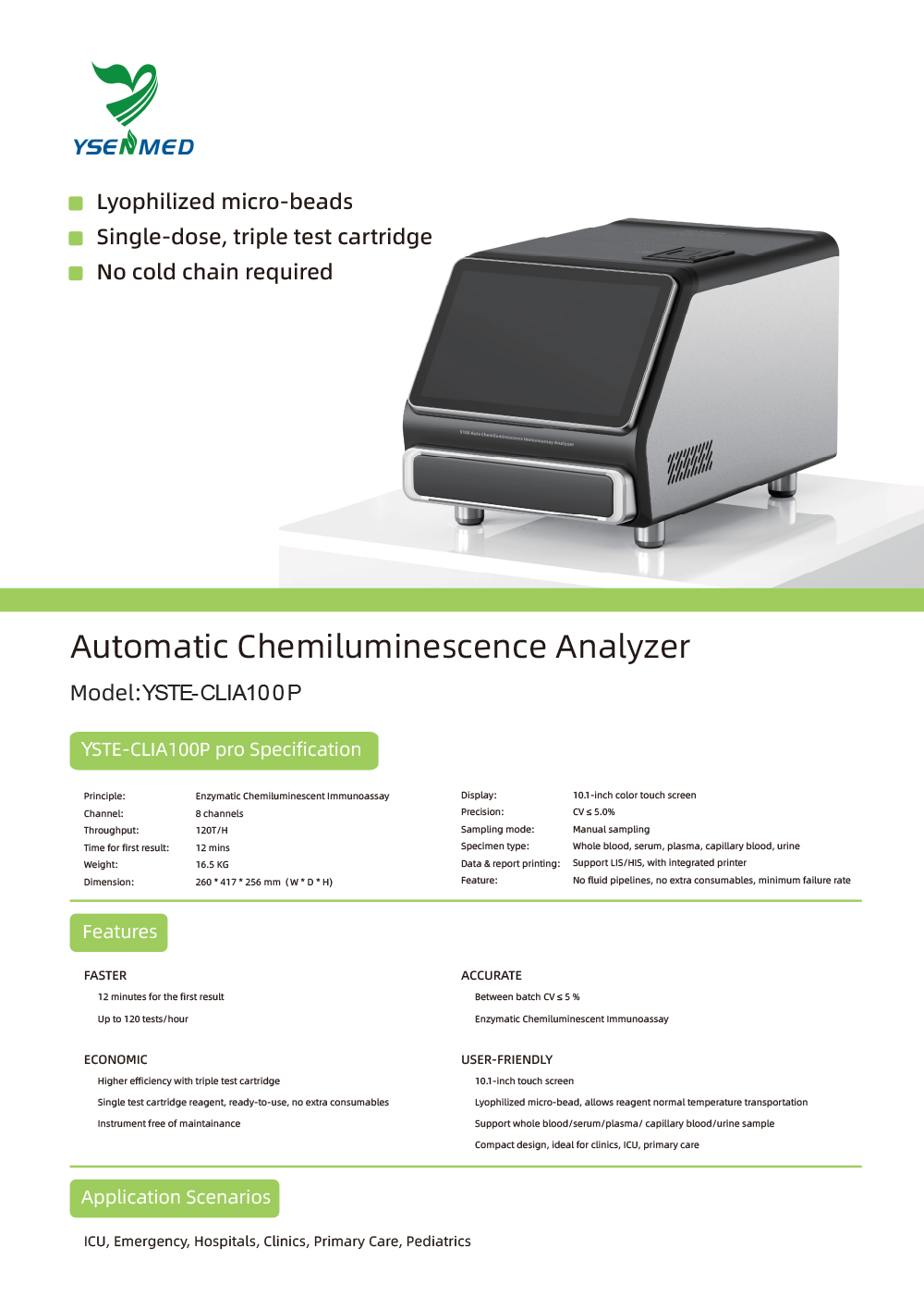Écran tactile de 10,1 pouces. Microbilles lyophilisées permettant le transport des réactifs à température normale. Compatible avec les échantillons de sang total, de sérum, de plasma et de sang capillaire. Conception compacte, idéale pour les cliniques, les unités de soins intensifs et les soins primaires.