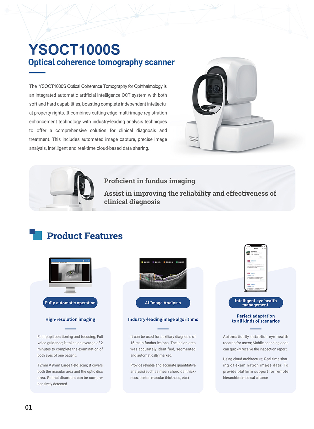 Le YSOCT1000S est un système OCT IA entièrement automatisé offrant une imagerie ophtalmique rapide et précise ainsi qu'une analyse intelligente pour une efficacité clinique optimale.